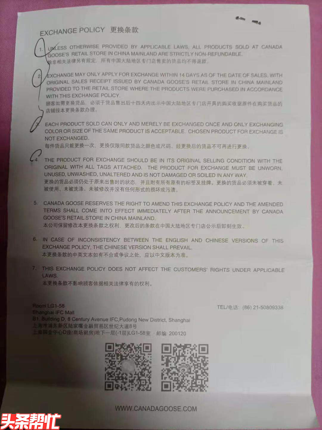 贾姓顾客还透露,在购买一件加拿大鹅羽绒服之时还被要求签署一份《更换条款》,其中第一条规定“除非相关法律另有规定,所有中国大陆地区专门店售卖的货品均不得退款。”