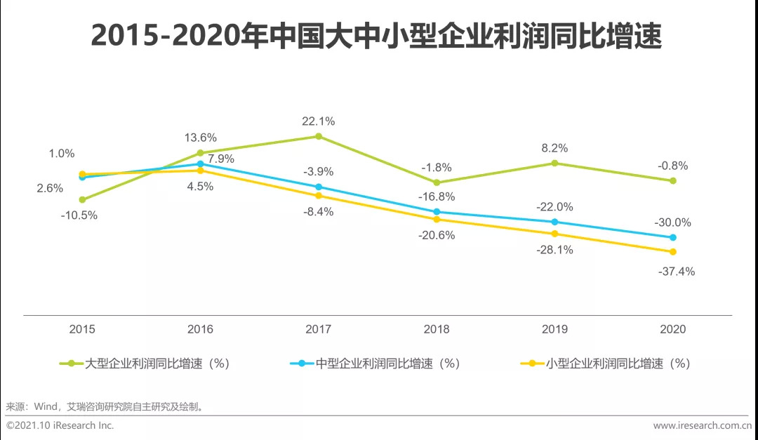 小微生存艰难:中小型企业利润同比增速一路下滑, 2020年利润下滑比率同比超过30% 。