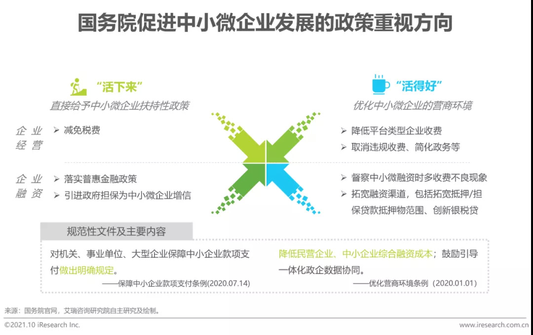 当下,政府促进中小微企业发展的政策,从“活下来”,“活得好”两个方向,帮助中小微企业的企业经营与企业融资。一方面,给予中小微企业扶持性政策,通过政府补贴降低中小微企业经营与融资成本,帮助中小微企业活下来,如减免税费、普惠金融政策等;另一方面,优化中小微企业营商环境,颁布规范性与创新性政策,帮助中小微企业“活得好”,如取消违规收费,拓宽企业融资渠道等。