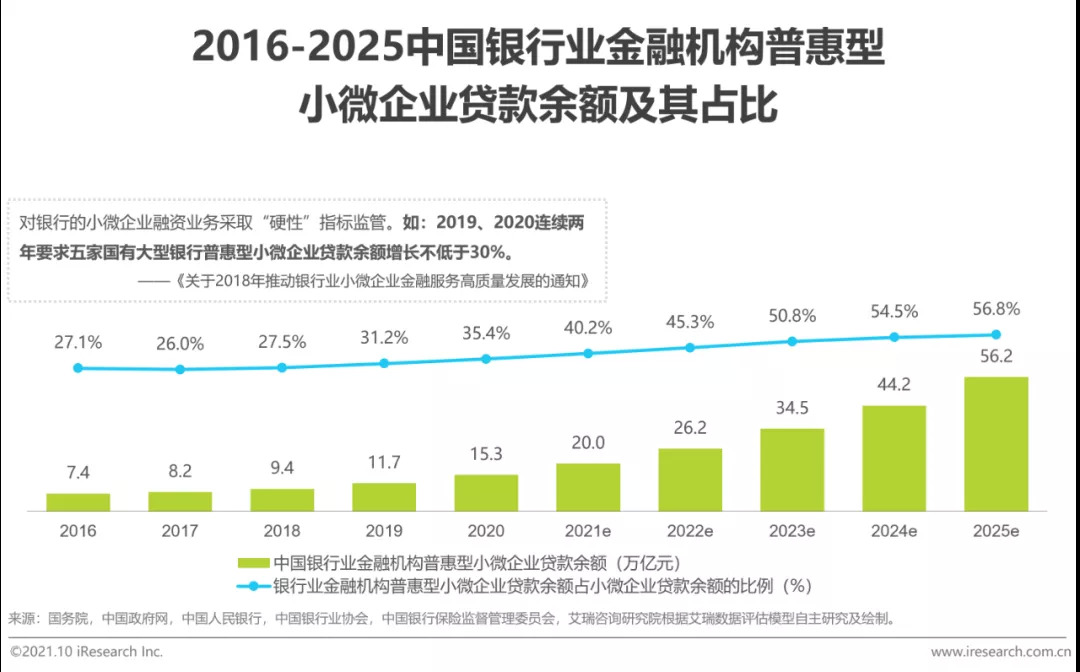 考虑到银保监会对银行业金融机构普惠型小微企业贷款余额增速的要求、各地区金融机构的政策实施能力、小微企业生存现状等影响因素,预计到2025年中国银行业金融机构普惠型小微企业贷款余额将增长至56.2万亿元。
