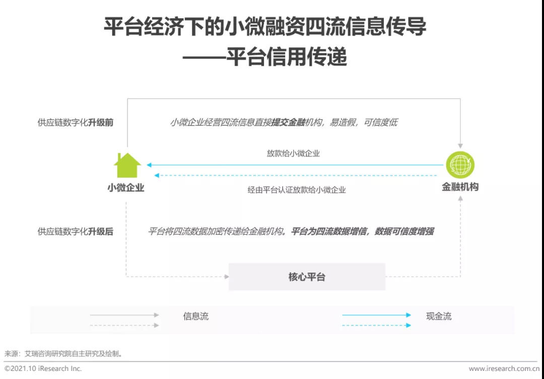 过往小微企业直接将经营数据传递给金融机构,信息可信度低,验证成本高。供应链四流数字化升级后,核心平台给小微企业融资增信;这个过程,实质上是依托供应链四流的数字化,实现了核心平台信用向中小微企业的信用传递。