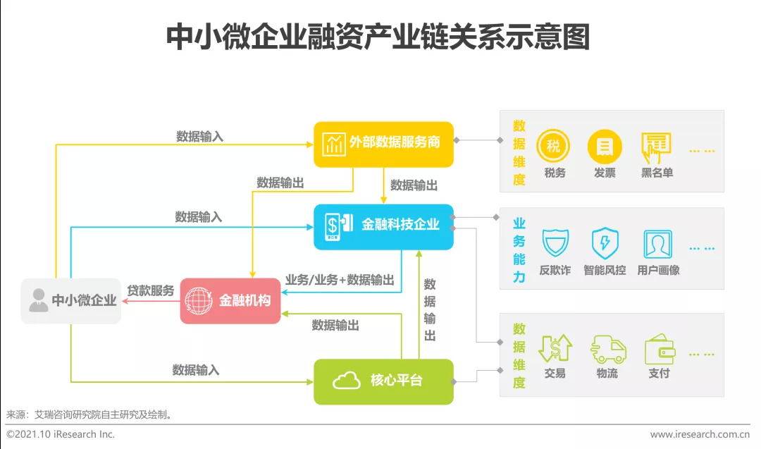 平台经济下中小微企业融资产业链关系图谱中有四类参与主体,分别为金融机构、金融科技企业、核心平台、外部数据服务商。外部数据服务商为金融科技企业、金融机构提供税务等外部数据,核心平台给金融机构或金融科技公司提供与中小微企业相关的数据;金融科技企业赋能金融机构反欺诈、智能风控、用户画像等业务能力,部分金融科技企业也可通过与中小微企业交互或核心平台合作提供中小微企业相关数据;金融机构基于金融科技企业与核心平台提供的数据与业务能力,为中小微企业提供贷款服务。与此同时,金融机构、金融科技企业、核心平台三者并非完全割裂,一个参与主体可能同时扮演多个角色,如有些金融机构既扮演金融科技企业角色也扮演核心平台角色。