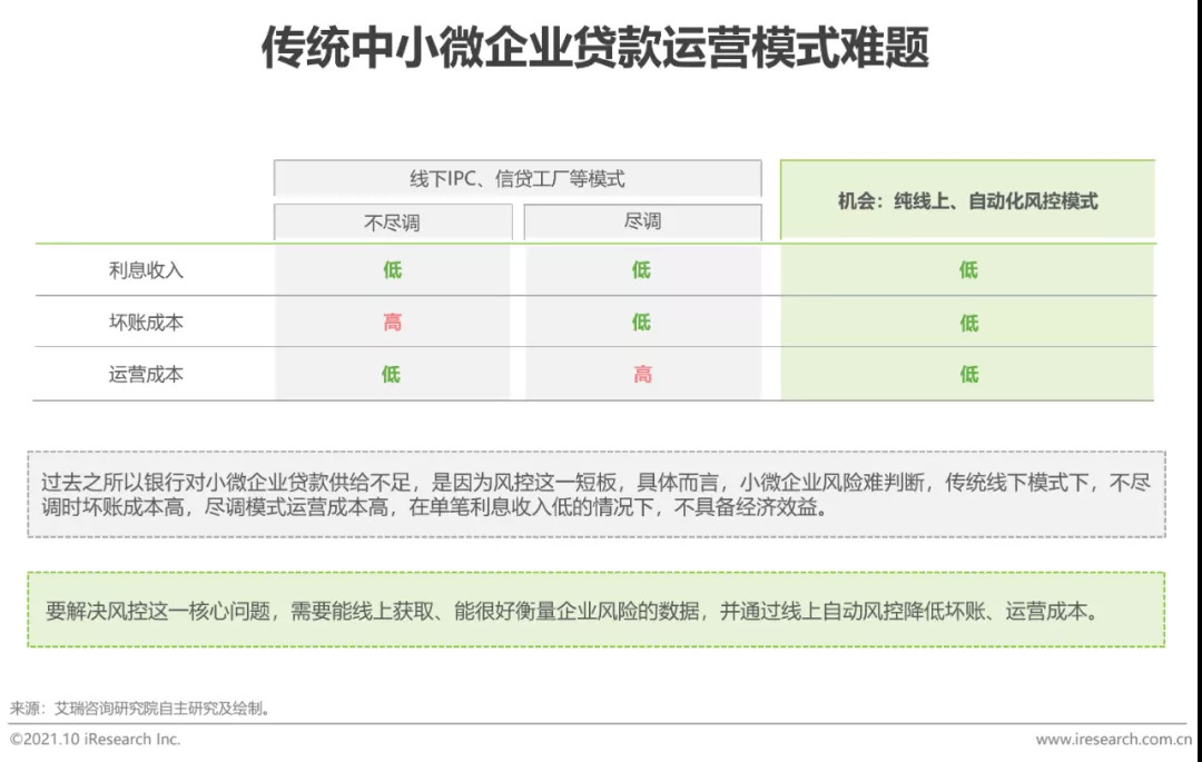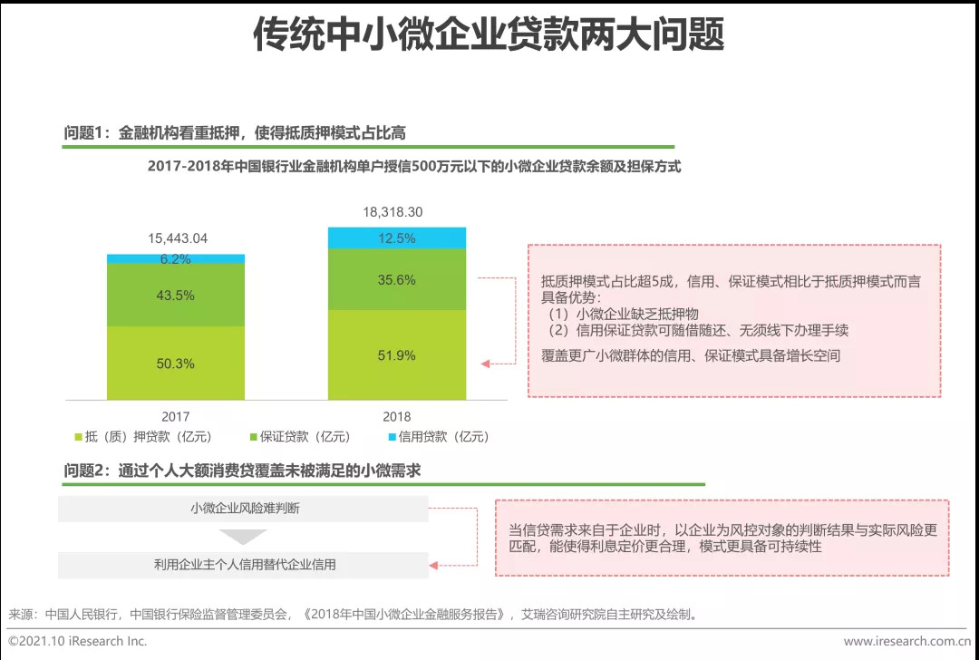 因为过去传统模式风控问题的存在,使得小微企业融资出现:a.看重抵押;b.通过个人大额消费贷覆盖小微需求等特征,风控短板问题解决后,纯信用、以企业为风控对象的模式具备增长空间。