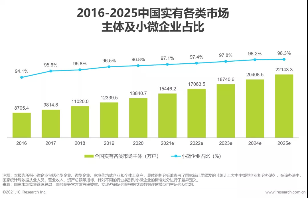小微企业是中国国民经济和社会发展中不可或缺的重要力量,在增加就业岗位、提高居民收入、保持社会和谐稳定等方面发挥着举足轻重的作用。小微企业是国民经济增长的重要驱动力,在全国实有各类市场主体中占据绝对数量优势。自2016到2020年间,全国实有各类市场主体从8705.4万户上升到13840.7万户,而小微企业占比也从94.1%增长到96.8%。