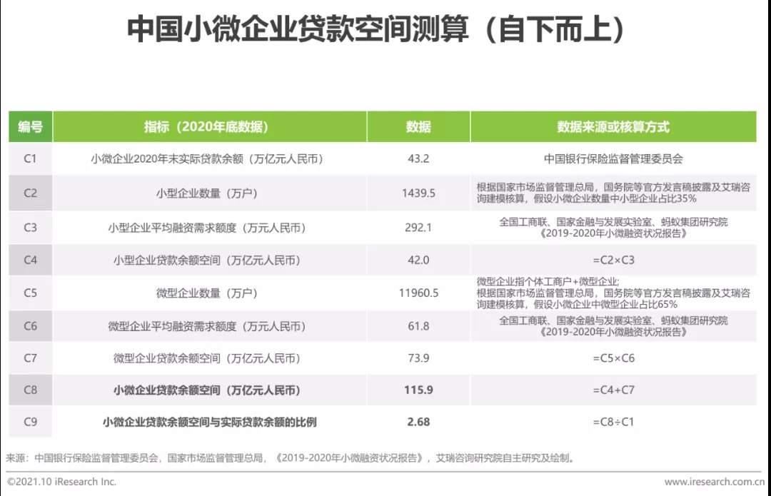 以中国小微企业单户融资需求为基准,以满足所有小微企业融资需求为目标,估算小微企业融资空间,预计为2020年末实际贷款余额的2.7倍。