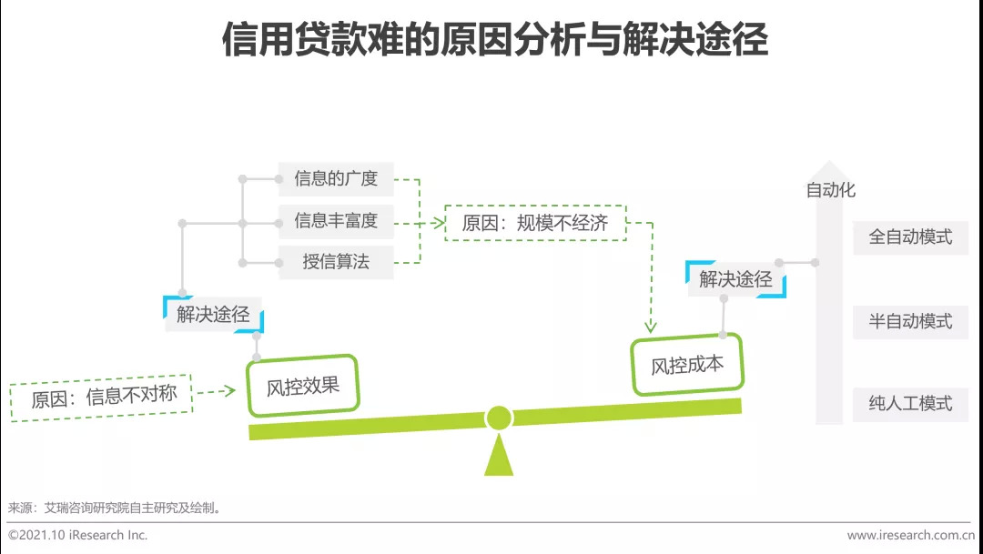 信用贷款风控难的原因包括两方面。一提高风控效果难。小微企业因管理不完善、报表不规范,其信用水平难以依靠小微企业提供的信息进行很好地评估。二风控的成本与效果难两全。风控的效果与耗费的成本是“跷跷板”的关系。在过去纯人工进行信息收集、风险评估的方式下,要提升这些方面需要投入较多的人力和成本,而这将使得风控的成本上升。