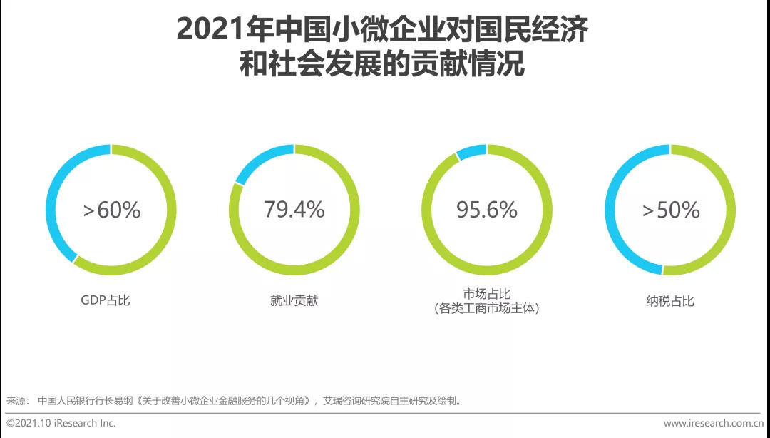 从小微企业对国民经济的贡献上看,央行行长易纲2018年在《关于改善小微企业金融服务的几个视角》的演讲报告中曾指出,中国小微企业最终产品和服务价值占GDP的比例约60%,纳税占国家税收总额的比例超过50%,以及70%以上的技术创新和城镇劳动就业贡献。