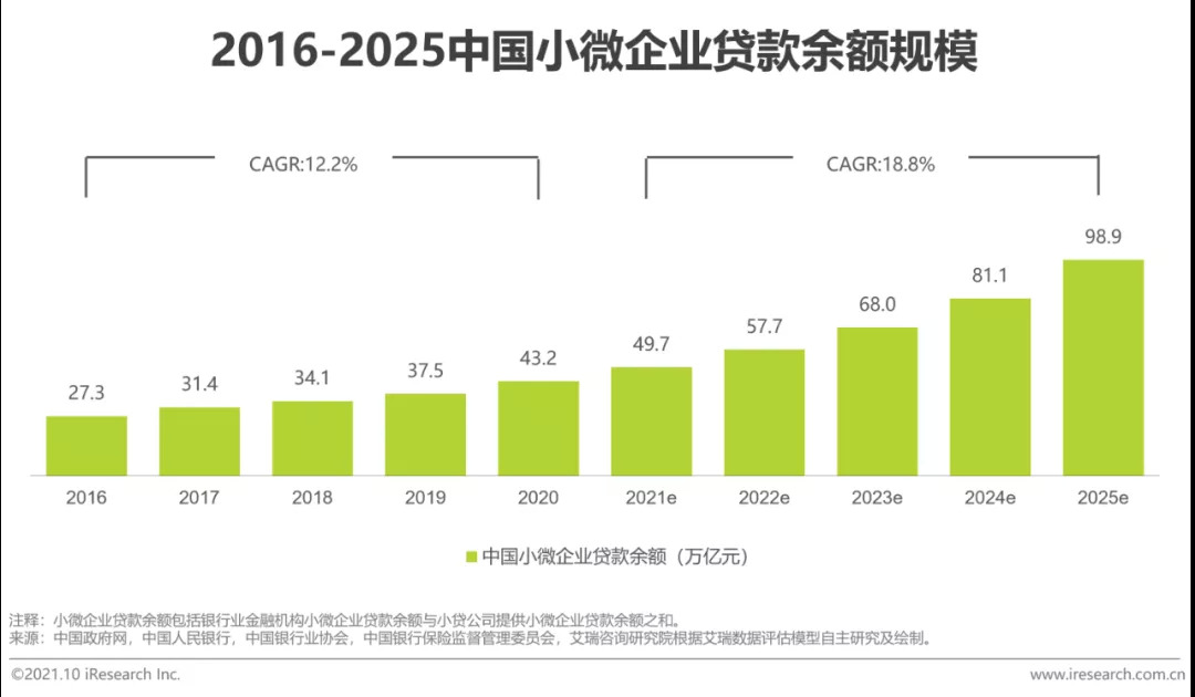 小微贷款规模:中国小微企业贷款余额规模自2016年的27.7万亿元增长到了2020年的43.2万亿元,年复合增长率达12.2% 。