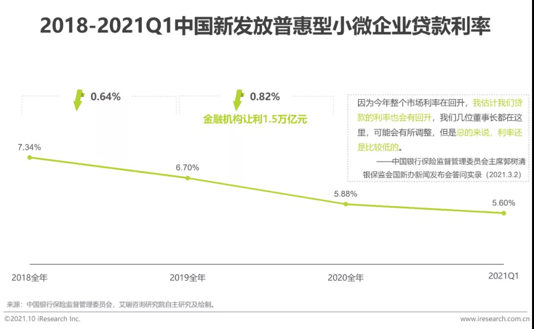 从2018年到2021年3月,我国新发放的普惠型小微企业贷款利率逐期下降。2018年全年为7.34%;2019年全年为6.7%,较2018年下降0.64%;2020全年为5.88%,较2019年下降0.82%;下降幅度高于2019年下降幅度,原因在于疫情背景下,金融机构让利实体经济1.5万亿元。