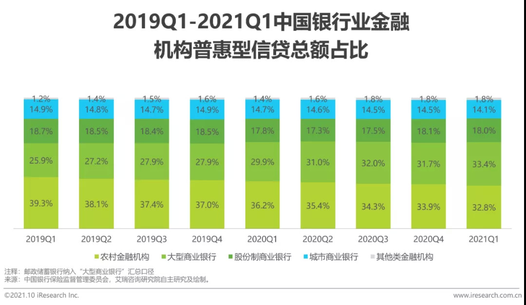 普惠型信贷市场中,有大型商业银行、股份制商业银行、城市商业银行、农村金融机构四大参与者。当前,大型商业银行的贡献比例最高,贡献比例为33.4%;从2019Q1到2020Q1,也是唯一的贡献比例正增长的参与者,平均每年贡献比例增长3.75%。原因有四:一是政策指示,国务院及银保监多次颁布政策通知大型商业银行加强普惠金融事业部的建设;二是指标压力,银保监构建了商业银行小微企业金融服务监管评价体系;三是能力支撑,大型商业银行的资金、业务等实力能支撑起普惠金融建设的重任;四是利率低,大型商业银行的普惠信贷利率远低于银行业平均普惠信贷利率,如,2019年五大商业银行新发放普惠型小微企业贷款平均利率为4.7%,银行业平均普惠信贷利率为6.7%。此外,由于农村金融机构数量众多、分散各地,且本就服务于本地小微企业,虽然其贡献比例逐期下降,但贡献比例也较高,2021年Q1为32.8%。
