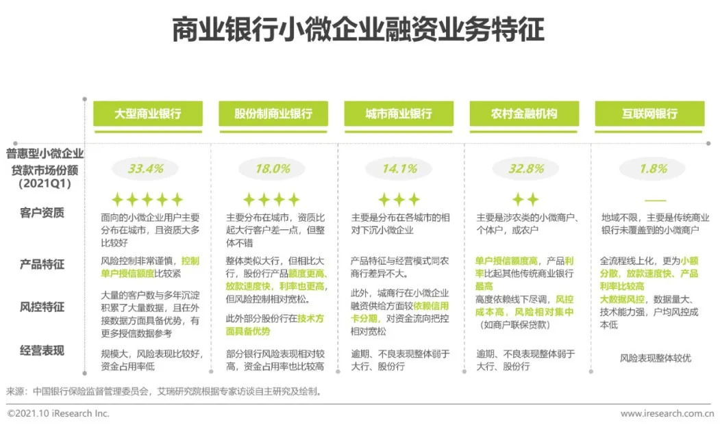 对于贷款业务而言,一个核心是更高风险往往意味着更高的产品定价。相比城商行、农村金融机构等中小行,大型商业银行与股份行拥有更大的客户基础与资金、技术能力,在发展小微企业融资业务方面具备优势,其中,为与大行竞争,股份行提供的产品整体额度更高、放款速度更快,利率也相对高一些。大行与股份行的优势也使得中小行必须通过触达更下沉用户的方式以形成差异化竞争策略,随着而来的是更高的风险表现。此外,近几年高速发展的互联网银行由于具备较强的技术基础,通过互联网的形式触达到了更多的长尾商户,整体特征更为小额、分散,但目前所占市场份额仍非常少。