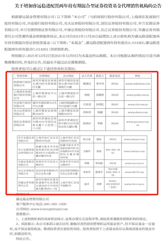 早在11月26日,睿远基金就公告,选择招商银行、上海浦发银行、兴业银行、光大证券、国信证券、申万宏源证券、申万宏源西部证券、中泰证券、长江证券、华鑫证券等10家销售机构作为代销渠道。