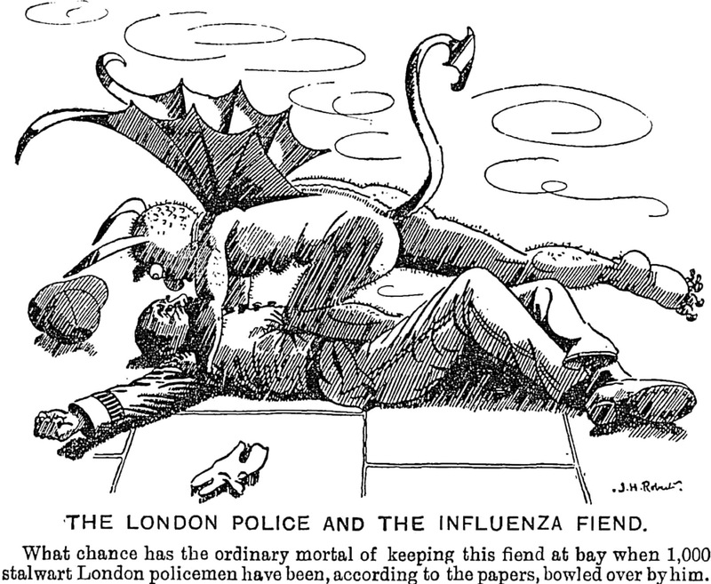 在此之前,男性的健康被认为取决于精神和身体的坚忍或勇气,男性声称自己身患流感,或表达对流感的担忧会引发品格质疑。而当流感普遍存在时,医生们开始意识到,“强健的体魄”并不能预防流感,男性甚至比女性更容易得流感,因为他们的职业使他们更容易疲劳,因此更容易遭到病菌侵袭,男性患者不再动辄被视为疑病症患者或装病者,相反,公共宣传材料开始告诫人们警惕流感威胁。1895年疫情高峰时期,《好玩》杂志刊登了一幅漫画,一个伦敦警察躺在地上,一个恶魔趴在他的胸口。漫画标题下写着:“根据报纸的说法,已经有1000名强壮的伦敦警察被这个恶魔击倒,普通人有多大的机会能够逃脱呢?”在霍尼斯鲍姆看来,这幅漫画的作者将恶魔和强壮的、象征着正义的警察并置,可能是在无意间利用了弥漫在维多利亚哥特小说中关于分裂的男性主体的世纪末焦虑。