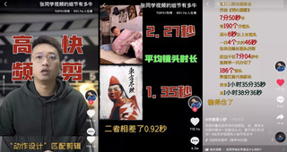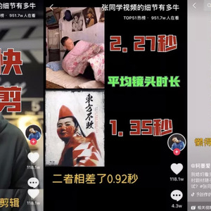据@轲墨爱小野 统计,张同学平均每条视频含有186个分镜头,每个镜头平均时长2.27秒,而好莱坞电影的单镜头平均时长也在3-4秒。很快,高频快剪、多机位拍摄、洗脑BGM成为张同学的创作标签,这种模式在无形中消解了人们长时间观看的视觉疲劳。