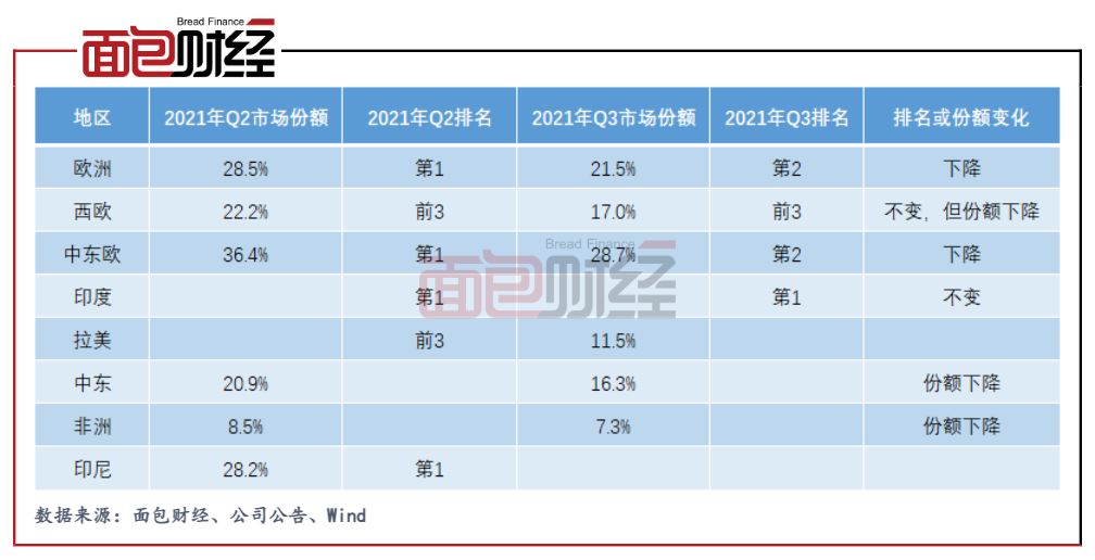 但到了2021年第三季度,小米的全球智能手机市占率下滑至第三名,市占率约为13.5%。公司在全球国家和地区市占率排名第一的数量减少至11个,而价值量相对更高的欧洲地区市场份额下滑至第2位。此外,公司在中东、非洲地区的市场份额也有所下降。