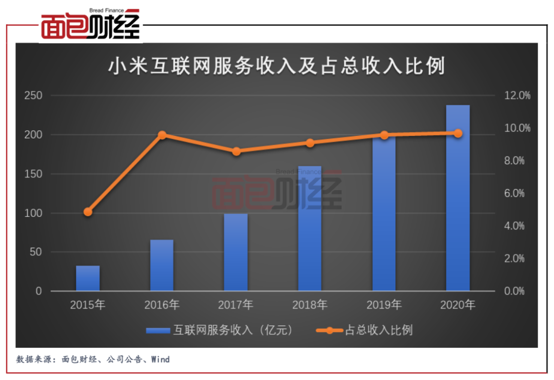 伴随用户数量增长,小米互联网服务收入从2015年32.39亿元上升至2020年237.55亿元,同期的总收入占比从4.9%上升至9.7%。