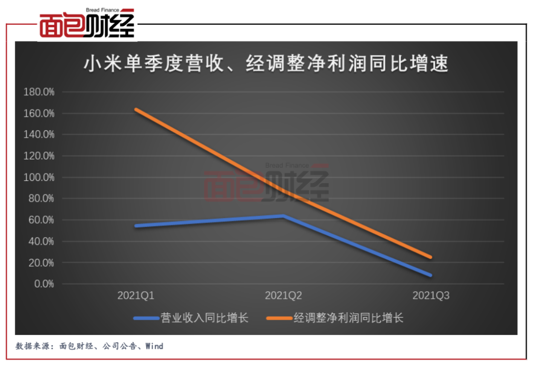 但是,第三季的表现让市场失望。第三季度,小米营收同比仅增长8.2%,增速较上半年下跌51.3个百分点。单季经调整净利润同比增长25.4%,增速较上半年下跌93个百分点。