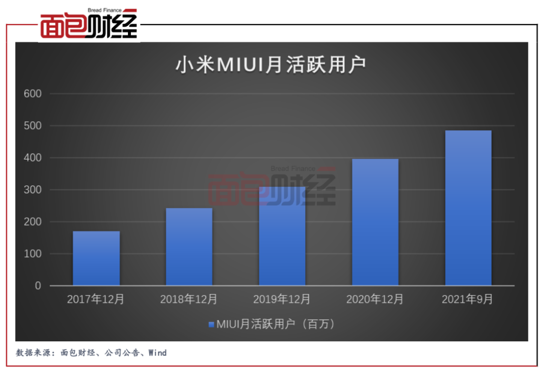 据公司招股书披露,截至2018年3月,公司基于安卓原生态系统的自有操作系统MIUI拥有大约190百万月活跃用户。到了2021年9月,小米的全球MIUI月活跃用户数达到485.9百万,同比增长32.0%。