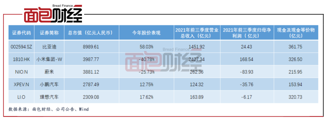 从市场表现来看,投资者显然更相信困难的那一部分。在今年新能源汽车相关股票整体大幅上涨的背景下,小米官宣造车后并没有给公司股价带来多少支撑。对比新能源车企比亚迪、蔚来、小鹏汽车、理想汽车,小米今年前三季度的营收、归母净利润均位居第一,但截至12月2日的市值却明显低于比亚迪,仅与蔚来较为接近。同时,通过股权、债券等方式融资,比亚迪以及造车新势力企业账上也积累了较为充裕的现金。