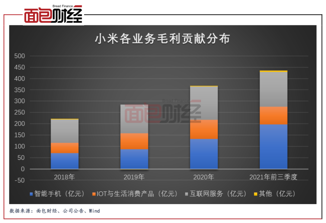 由于互联网服务较高的毛利率,该业务持续贡献小米主要的利润来源。查阅小米2018年至2020年各业务的毛利贡献分布,互联网服务始终是公司的第一大毛利来源。