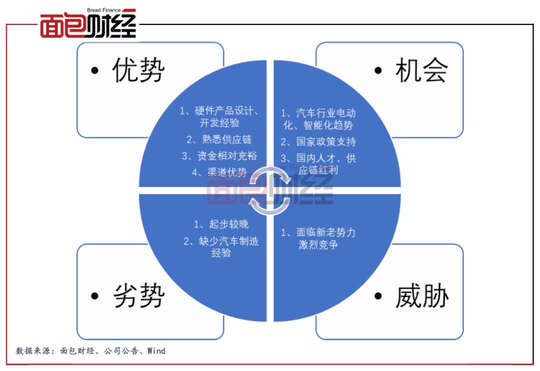 但另一方面,汽车的复杂度远高于手机,公司目前并无直接的汽车制造相关经验,未来需要跨越品质、产能、交付等多个门槛。此外,相比其他造车新势力,公司入局时间较晚,在有限的时间内补足短板并实现超越的难度可想而知。
