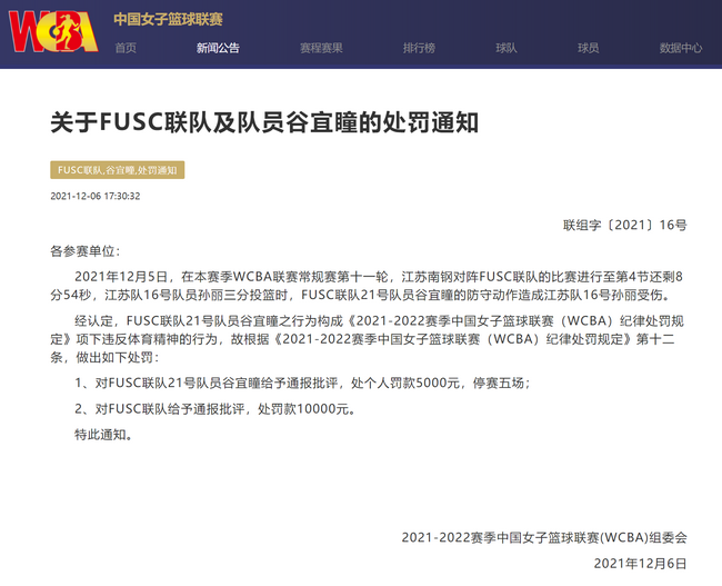 北京时间2021年12月6日傍晚,WCBA联赛官网发布关于FUSC联队及队员谷宜瞳的处罚通知:对FUSC联队21号队员谷宜瞳给予通报批评,处个人罚款5000元,停赛五场;对FUSC联队给予通报批评,处罚款10000元。
