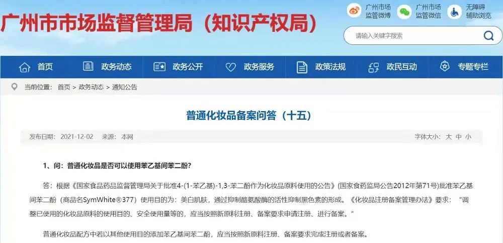 没过几天(12月2日),广州市市场监督管理局又发布了《普通化妆品备案问答》,表示“普通化妆品配方中若以其他使用目的添加苯乙基间苯二酚(俗称‘377’),应当按照新原料注册、备案要求完成注册或者备案”。