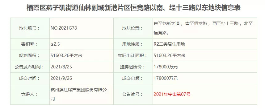 新尧新城G78于今年9月底,被杭州滨江竞得,楼面价13798元/㎡,毛坯房限价15735元/㎡。