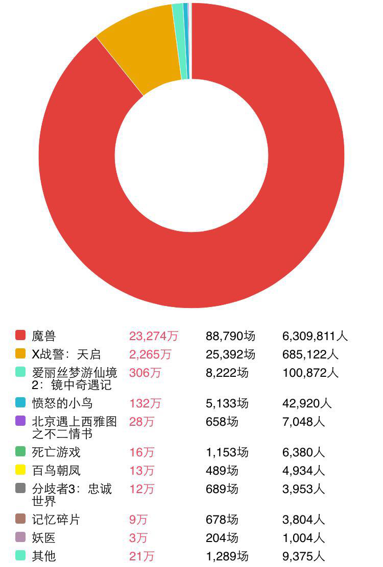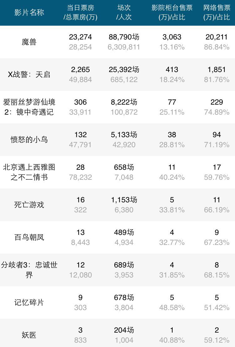 魔兽电影口碑炸裂,《魔兽》已于6月8日(本周三)以全制式登陆中国内地影院。这部承载了众多人青春记忆的IP电影,在6月7日零点场便狂澜近五千万票房,首日总票房超过三亿,创造了内地影史工作日零点场和首日票房的新纪录。《魔兽》高开的走势不仅仅要归功于游戏粉丝,还多亏了院线经理们的抬爱。在上映仅5天的《X战警:天启》的竞争下,全国10万场排片及65%的占比远超预期。