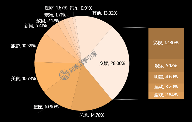Z世代认为,“每个人都是独一无二的、都应该被接受”,TA们有着个性化需求和多重身份标签。近30%的Z世代热衷议论文娱内容,其次是占比10%左右的艺术、星座、美食、旅游。在文娱内容中,Z世代最关注影视剧,其次是娱乐、明星、运动和游戏。