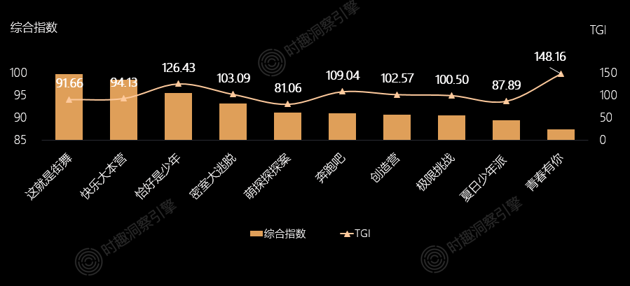Z世代对综艺内容的需求多元,其中竞技表演、真人秀、观察、推理解密类综艺较多,竞技表演和真人秀的热议内容占比过半。目前,综艺逐渐向垂直化、细分化发展,例如在竞技表演基础上推出音乐、舞蹈、说唱等综艺。从TGI来看,Z世代对《青春有你3》最为偏好,不论是节目内容或是节目相关事件都引发了Z世代的大量讨论,《这!就是街舞》综合热度最高。