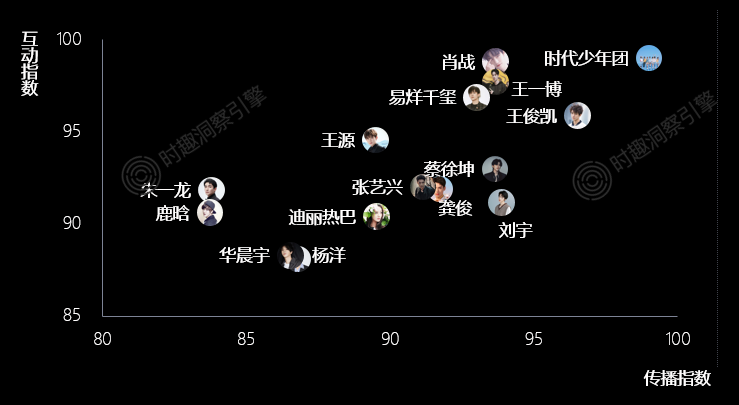 根据时趣洞察引擎数据,时代少年团作为多人团体拥有多名高人气成员,传播效果及互动指数均有较好表现,综合影响力排名第一,肖战、王一博紧随其后。综合来看,拥有团体或选秀经历的艺人更易受Z世代关注。