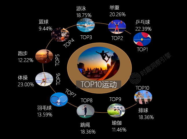 东京奥运会的举办,进一步激发了Z世代群体的运动热情,乒乓球、举重、游泳等热门项目成为提及率最高的运动。除此之外,常规运动如跑步、羽毛球、瑜伽等深受Z世代喜爱。颜值经济的盛行,使Z世代对自身颜值及身形都有较高要求,多通过运动来达到减肥、肌肉锻炼、塑性纤体等目的。