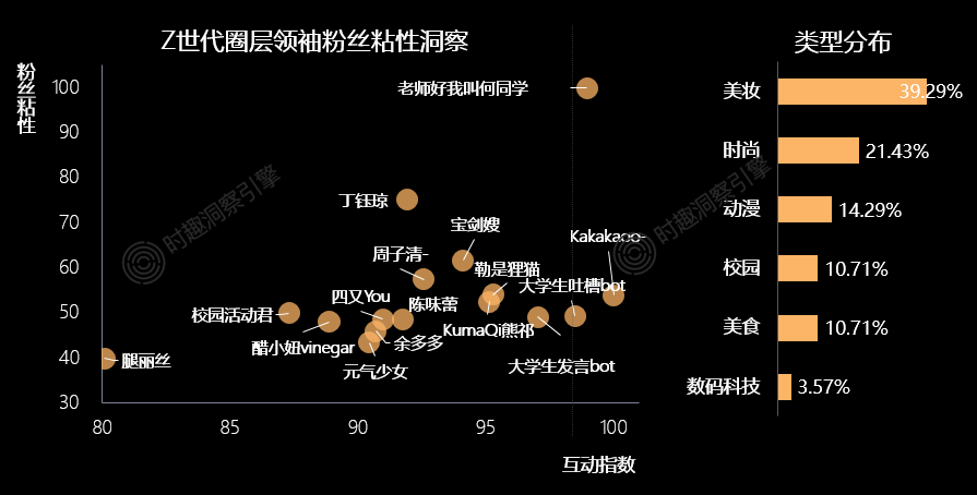 如今,Z世代内部的圈层领袖也逐渐成形,以美妆、时尚类为主。数码科技类KOL@老师好我叫何同学 的输出内容的高质致使其粉丝粘性最高,@kakakaoo- 近半年凭借内容多样互动量最高,这些圈层领袖的粉丝以Z世代女性用户为主。