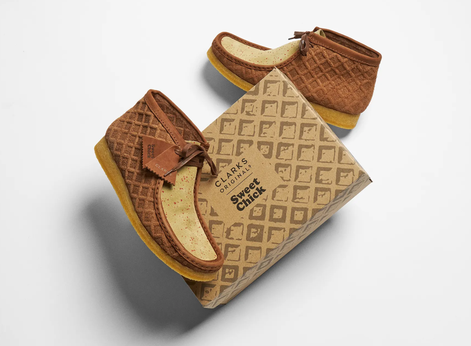 本次联名以Clarks超级经典的袋鼠鞋“Wallabee”鞋款为底本,并且在鞋身绒面上加入了超写实华夫格花纹,焦糖奶油配色更是让这个鞋款更加如同一块黄油华夫,可谓是非常彰显此次联名的特色和趣味性了。鞋面上还散落点缀着红色或绿色的斑点,如同散落在华夫饼上的覆盆子和香草碎。