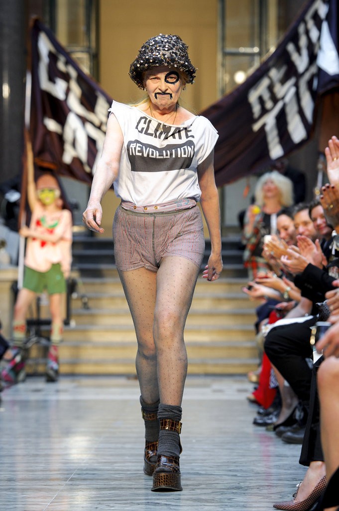 2013伦敦春夏时装周,为提倡环保精神,72岁的她亲自上阵压轴走秀,身上的写着Climate Revolution(气候革命)的标识。她呼吁人们无需购买她的衣服,以减少资源浪费。