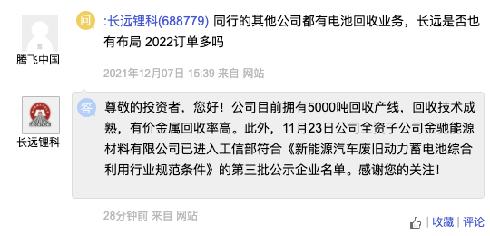长远锂科12月13日在“上证e互动”平台回答投资者提问时称:公司目前拥有5000吨回收产线,回收技术成熟,有价金属回收率高。此外,11月23日公司全资子公司金驰能源材料有限公司已进入工信部符合《新能源汽车废旧动力蓄电池综合利用行业规范条件》的第三批公示企业名单。