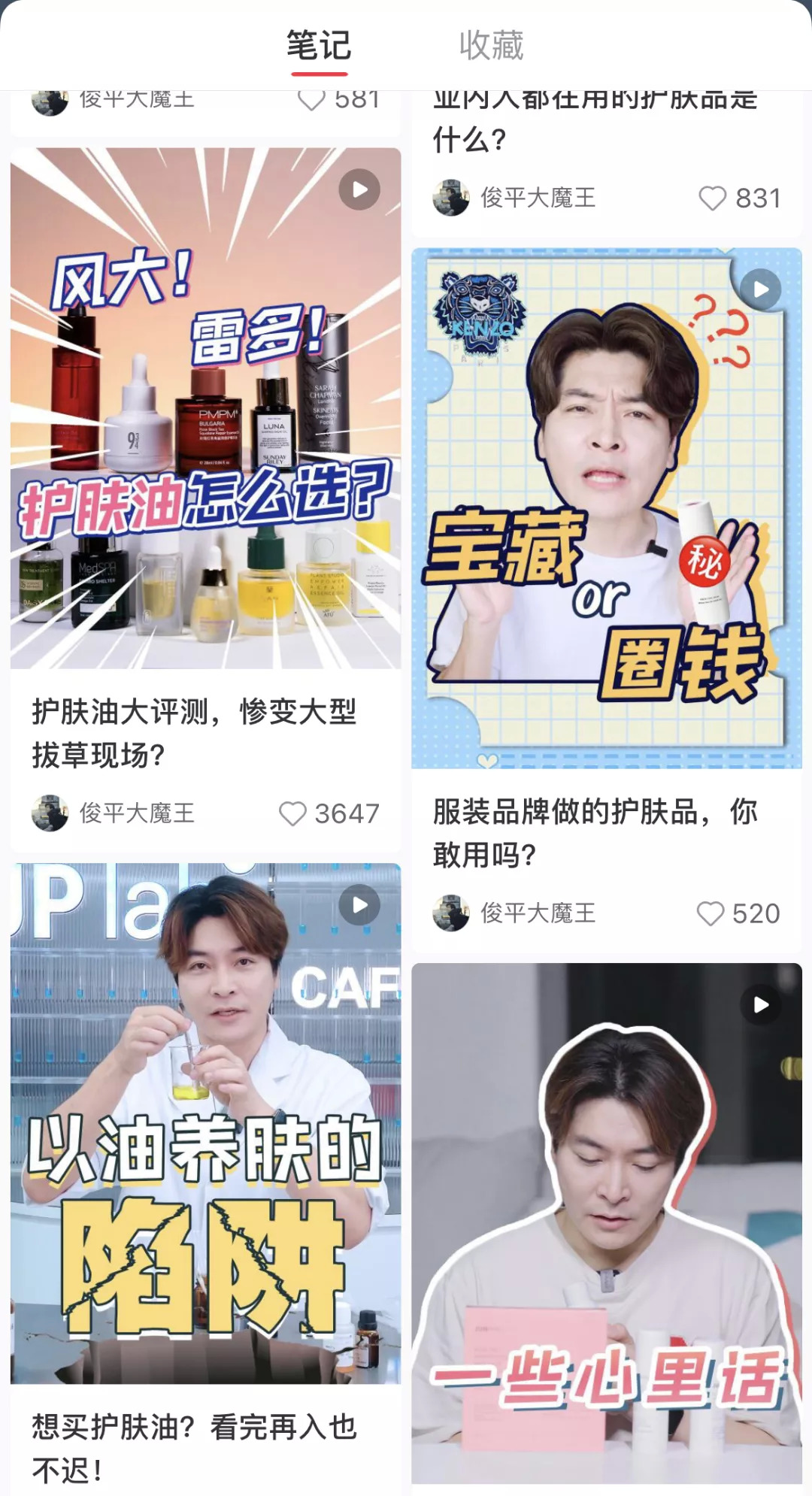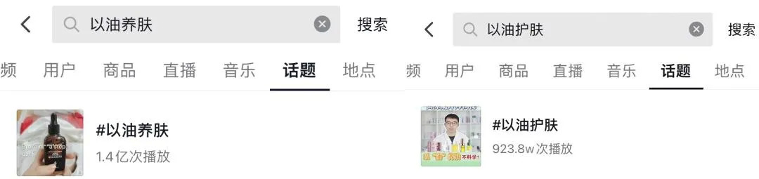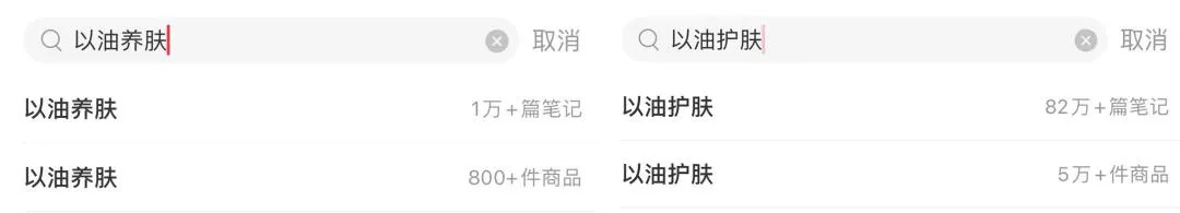回到小红书,本想着刷些养猫知识,结果看到了美妆博主骆王宇关于以油养肤的两则视频,在此不得不感叹下大数据,基于被“数据把控”,小C以“以油养肤”“以油护肤”为关键词在小红书、抖音平台上进行搜索,发现相关笔记分别达1万+、82万+,话题播放量次则达1.4亿次、923.8万次。