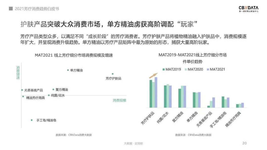与此同时,CBNData发布的《2021芳疗消费趋势白皮书》显示,近年来芳疗线上消费规模持续稳定增长,随着“疗愈风”刮进愈来愈多消费者心中,芳疗市场的消费人数增长已经领先于护肤整体。另外,随着消费规模逐年扩大和芳疗的普及,该市场呈现出了消费升级趋势,其中,单方精油以芳疗产品矩阵中最为原始的状态,捕获了大量高阶玩家。