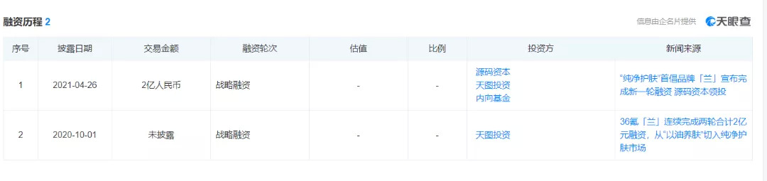 在资本上,“以油养肤”的理念作为切入点的LAN蘭同样也受到了认证。据天眼查显示,其与2020年10月1日、2021年4月26日分别获得了未披露、2亿人民币的战略融资,半年获得了两轮融资,LAN蘭的实力已显。