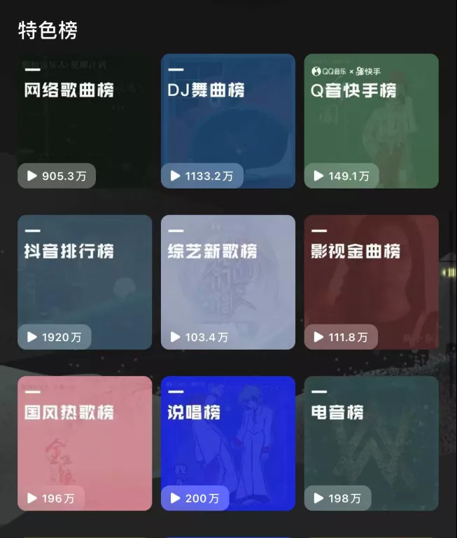 即使是抖音在音乐赛道的“劲敌”TME,也不得不承认抖音神曲带来的巨大流量。在QQ音乐的榜单列表内,“抖音排行榜”的播放量达到了1920万,在所有特色类榜单中位列第一,分列二三名“DJ舞曲榜”和“网络歌曲榜”,也基本被抖音歌曲占据。在热歌榜上,抖音歌曲也占据大量席位,其中包括刚获奖的《白月光与朱砂痣》《踏山河》等。