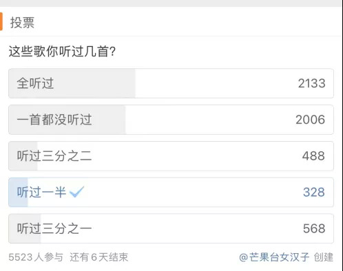 不满归不满,但无法否认抖音歌曲的热度。在一则超过5500人参与的微博投票里,有2133人表示这十首歌“全听过”,这也正是抖音歌曲的魔力。