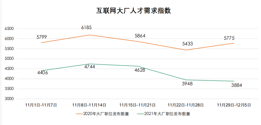 11月起,多家互联网大厂相继开启较大规模的人员架构调整。拉勾招聘数据研究院于近日发布的报告显示,自11月以来,互联网大厂的人才需求指数整体下降26%,对比去年11月中旬开始的招聘需求上涨趋势,今年反而出现下降。受大厂人员架构调整影响,招聘工作也变得更加谨慎。