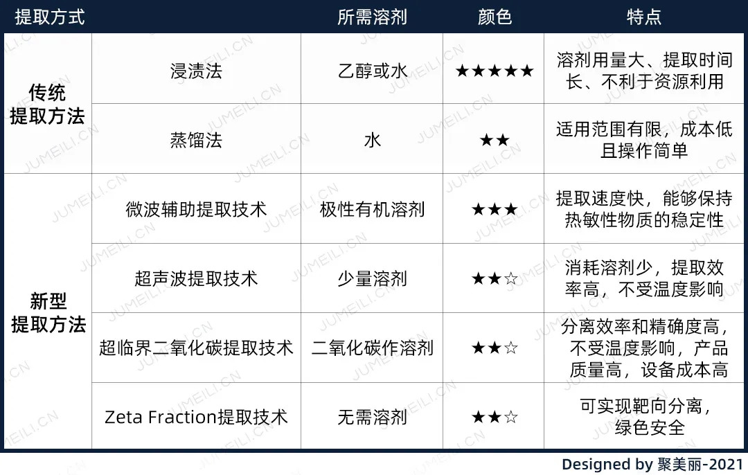 从提取工艺来看,传统方式有溶液提取法、蒸馏法等,而比较先进的技术有微波辅助提取、超声波提取、超临界二氧化碳提取法等。记者整理了一张表格,仅供参考。