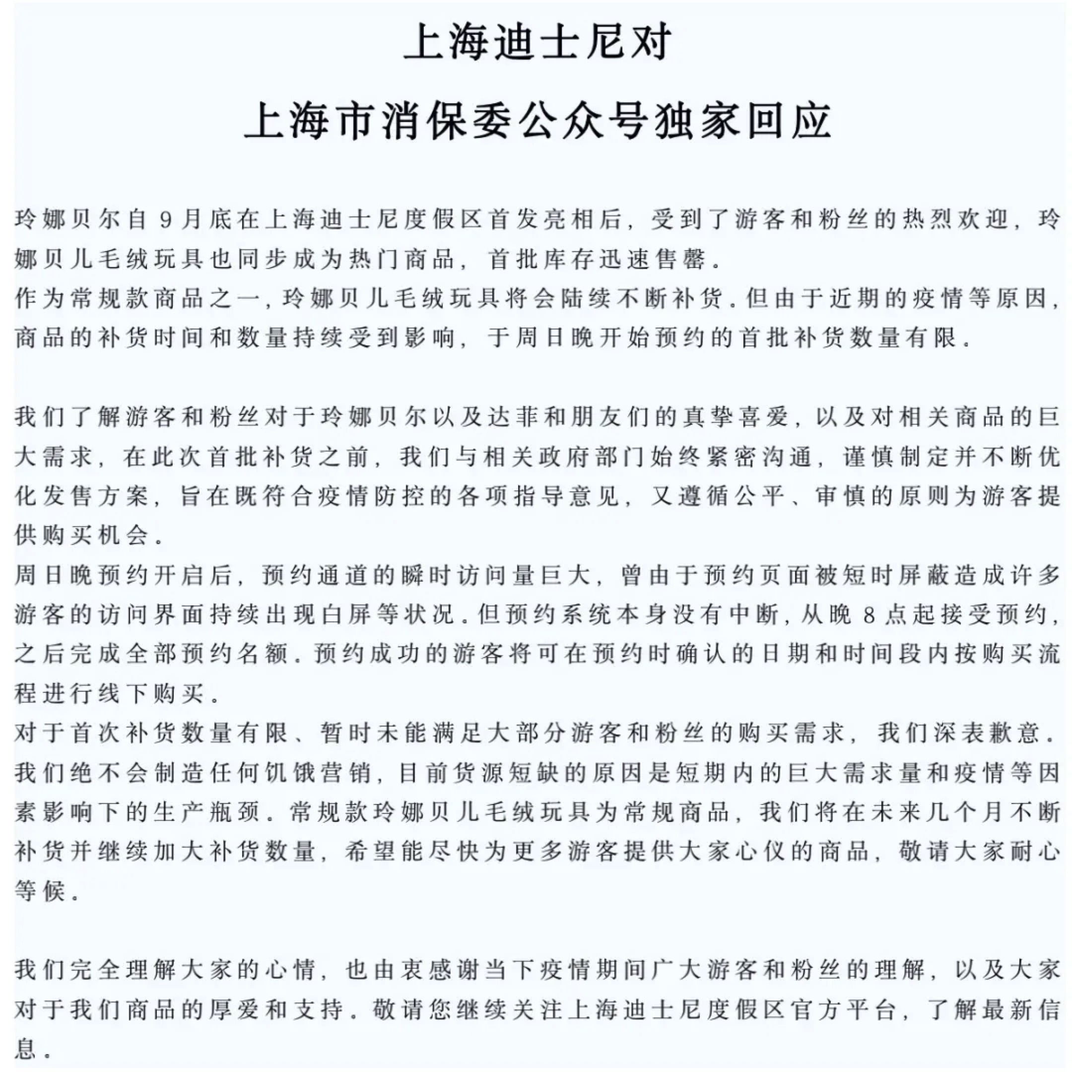 上海市消保委微信公众号12月14日消息,就玲娜贝儿玩具缺货一事,上海迪士尼回应表示,目前玲娜贝儿毛绒玩具货源短缺的原因是短期内的巨大需求量和疫情等因素影响下的生产瓶颈。迪士尼将在未来几个月不断补货并继续加大补货数量。上海迪士尼称,绝不会制造任何饥饿营销。
