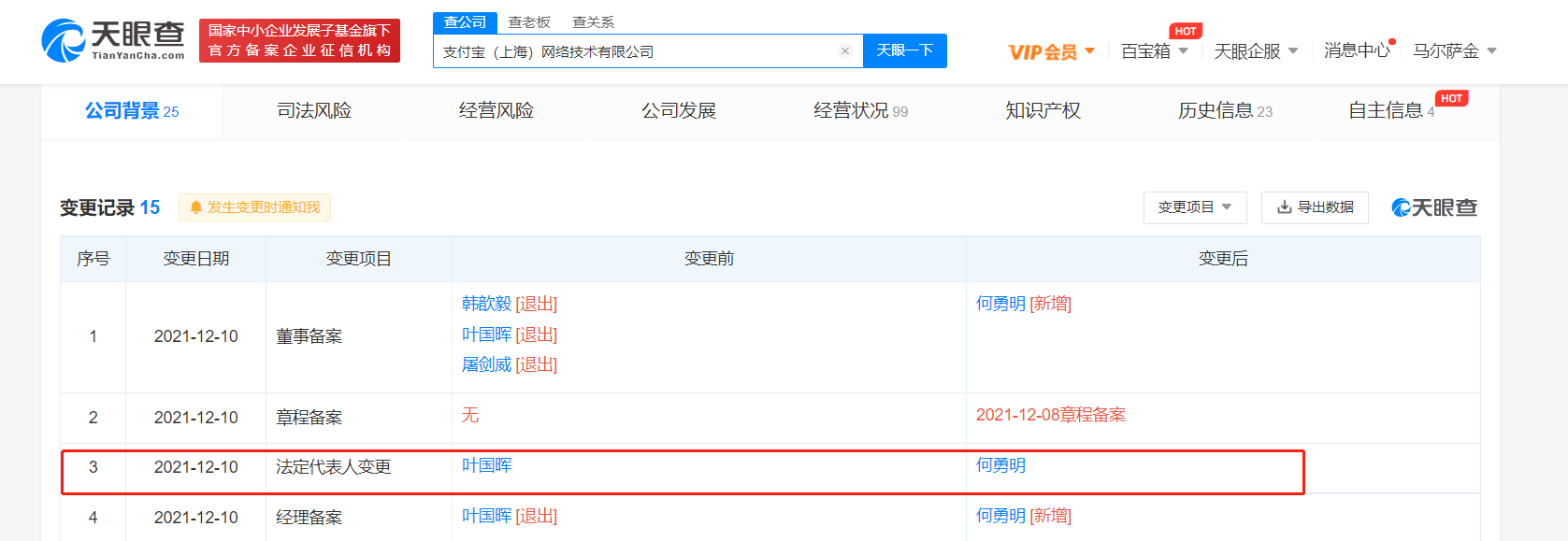 天眼查APP显示,12月10日,支付宝(上海)网络技术有限公司发生工商变更,法定代表人由叶国晖变更为何勇明。支付宝(上海)网络技术有限公司成立于2015年5月,注册资本1亿元人民币,该公司由支付宝(中国)网络技术有限公司全资持股。