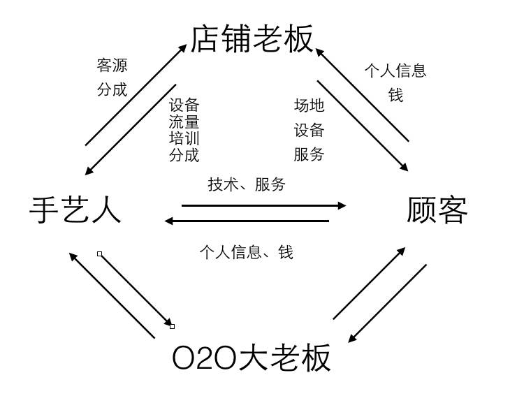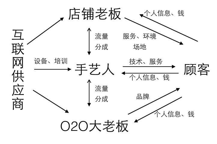 这个大老板就是美业上门O2O平台。而箭头代表的含义,可以根据上方店铺老板做镜面复制。至此,以河狸家、58到家等为代表的美业上门O2O到底解决了什么问题,一目了然:打破过去美业存在的“六店理论”,即连锁开到六家后,老板会请店长,如果店长能力弱,店会死,能力强又会自立门户(此为行业高度分散的原因,类似的还有饮品店),成为大老板。