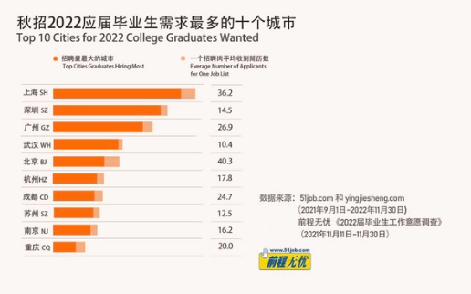 《行情》还显示,秋招2022应届毕业生需求最多的十大城市上,上海排名首位,紧接着是深圳、广州、武汉,北京排名第五。