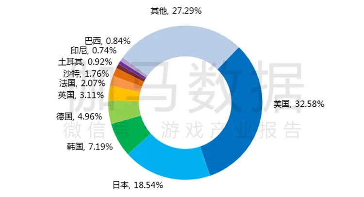 2021年,中国自主研发移动游戏海外重点地区收入分布中,来自美国市场的收入占比为32.58%,蝉联第一。来自日本、韩国的收入占比分别为18.54%和7.19%。