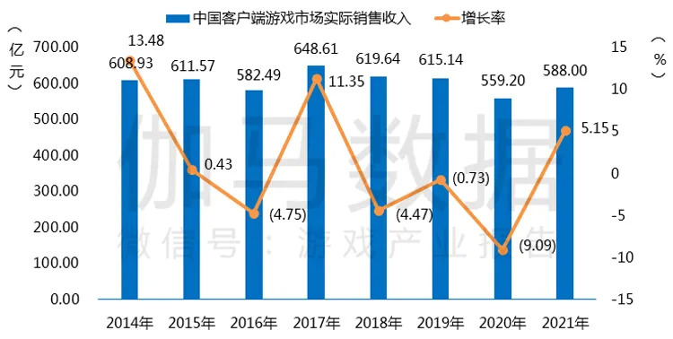 2021年,中国客户端游戏市场实际销售收入588亿元,比2020年增加了28.80亿元,同比增长5.15%,为近三年内首次出现增长的趋势。主要原因是,今年新上线的客户端产品表现出色;以移动游戏为核心的全平台发行模式逐步兴起;用户使用习惯回归等。